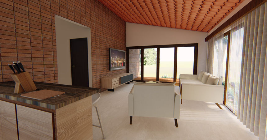 Basant Betons concrete blocks shell, with sloping 50mm Puff Panel roof installed on MS. Athangudi / Vitrified flooring, branded Kitchenette.